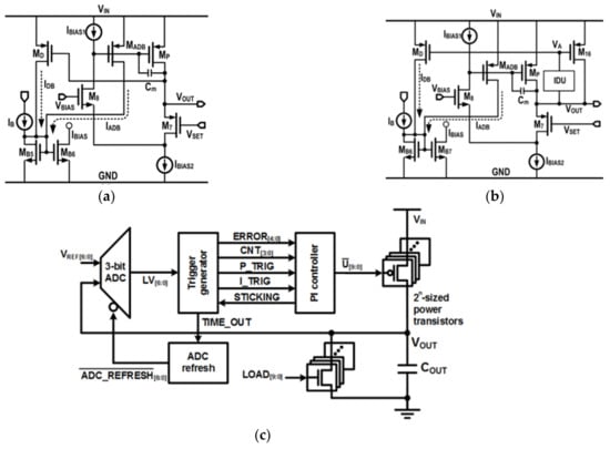 Many researchers focus on designing control circuits for LDOs with minimum power consumption. Control circuits consist of high-frequency processors that continuously monitor the regulated voltage of the LDO and generate feedback according to the regulated voltage. Currently, researchers are focused on using approaches such as time-coding architectures [] to drive LDO control circuits. Time-driven controllers operate at every clock edge. If the LDO output varies after a locking edge, the controller captures the deviation at its next cycle. As shown in Figure 8c [], the authors proposed an architecture consisting of analog-to-digital converter with a refresh circuit, proportional–integral controller, and a power transistor. By using time-coding architectures, LDO control circuits can be operated as event-driven controllers instead of continuously operating. As a result, consumption of quiescent current has been significantly reduced and the efficiency has increased to 93.6% [].