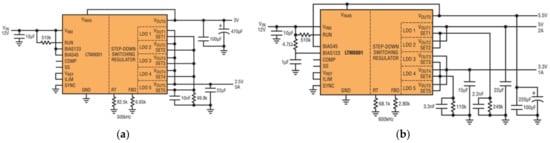 - Analog Devices. LTM8001: 36 VIN, 5 A ΜModule Regulator with 5-Output Configurable LDO Array 2013; Analog Devices: Norwood, MA, USA, 2013. [Google Scholar]