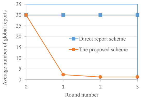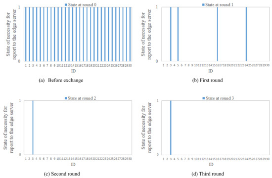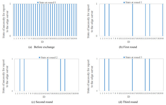 Figure 5 shows the necessary number of vehicles that need a global report of results to the edge server in Scenario 1 regarding the proposed scheme. The number of global reports before the local exchange of sensing information is 30. After the first round of local exchange, there are 6 vehicles that need to report its sensing results to the edge server. After the second round of local exchange, there are 5 vehicles that need to report to the server, and this number of necessary reports does not change after the third round of exchange.
