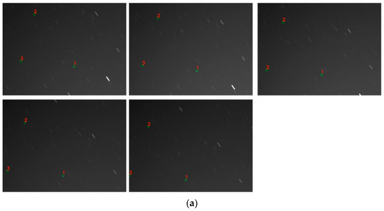 In order to better demonstrate the SpotGEO dataset, two groups of sequences are selected for display, containing the number of targets of 3 and 5 respectively, as described in Figure 2 and Figure 3. The visualizations of example images annotated with the corresponding annotation are shown in Figure 2a and Figure 3a–e. It is evident that some space targets are too faint and dark to be seen through human eyes. Possible causes include the cloud over, atmospheric/weather effects, star occlusion and sensor noise/defects. All these terrible factors indeed increase the difficulty of GEO space object detection problem. Furthermore, all the coordinates of objects in five consecutive frames are gathered together, explicit motion trajectories can be seen in Figure 2b and Figure 3f.