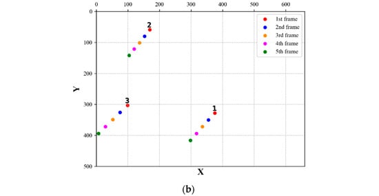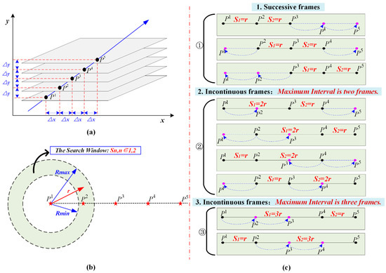 In the first step, considering all potential straight-line trajectories, we take a search window to group point sets. As shown in Figure 8a, a sample of space objects is captured in all 5 frames within one sequence denoted as . When all the are registered to a common coordinate system, the distance between any two adjacent points and is the same. According to the statistics of the training dataset, we obtained the maximum and minimum value of the interval distance as and . Then, we use the ringlike search window to group point sets of potential trajectories, as shown in Figure 8b. The special search strategy we take to improve efficiency is that the number of elements in each point set is limited to . Only the collinear cases of 3 points from successive or inconsecutive frames are considered, all of which are shown in Figure 8c.