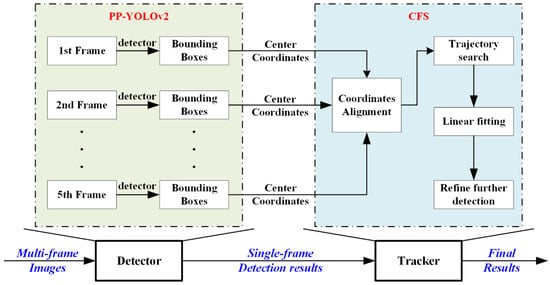 The flowchart of the proposed algorithm is represented in Figure 4. To summarize, the algorithm mainly consists of two parts. The 2D object detector PP-YOLOv2 primarily focuses on searching potential candidate target among all the frames according to the appearance features. Then, the tracker based on CFS is deployed to filtrate true targets and supplement misdetected objects.