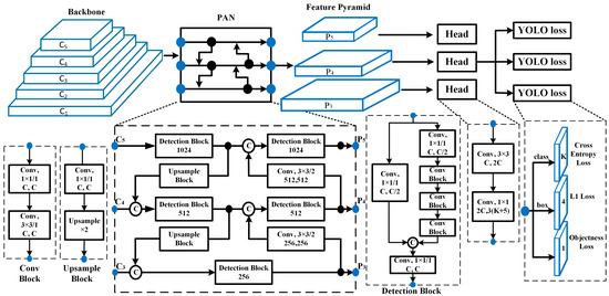 The backbone network is ResNet50-vd-dcn with deformable convolutional layers to increase the inference speed. One of the FPN variants named PAN is used as the detection neck to enhance the ability of pyramid representation. The detection head contains two convolutional layers: a 3 × 3 convolution followed by 1 × 1 convolution to obtain the final prediction. The number of predicted output channels is , where K represents the number of categories. Three different anchor points are assigned to each position of the predicted feature map. For each anchor point, the first K channels represent the predicted probability of the K category, the subsequent 4 channels represent the position, and the last channel represents the target score. The classification and localization loss functions are cross entropy loss and L1 loss, respectively.