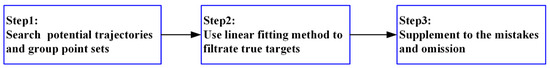 Then, in step 2, we implement linear fitting to all points sets resulted from step 1 and obtain all linear trajectories across the sequence frames. In step 3, according to the results from linear fittings based on a least-squares technique, we can compute the missed target coordinates and supplement for the final detection results.