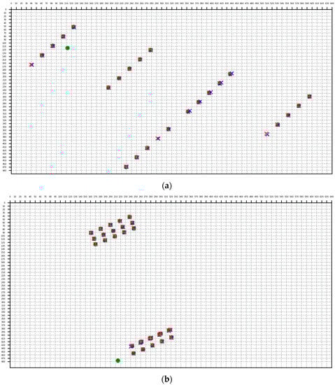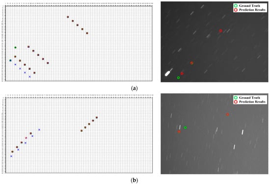 To describe the performance of the proposed method intuitively, several groups of prediction results are represented in Figure 9 and Figure 10. The prediction results of single-frame detection by PP-YOLOv2 are marked by the green solid circle and the final results after the post-processing procedure of CFS are marked by the red cross symbols. As a reference, the blue cross symbols indicate the ground truth. It can be seen from Figure 9a–c that the proposed CFS technique can effectively extract true space targets through the motion track information. On the other hand, it is also obvious that there is a relative discrepancy between the predicted and true target location. Combined with the remarkable metric of MSE value, this algorithm still needs to be improved and optimized in the future. A promising direction could be investigating different label transform strategies to see which type of labeled data has better accuracy for the target position estimation.