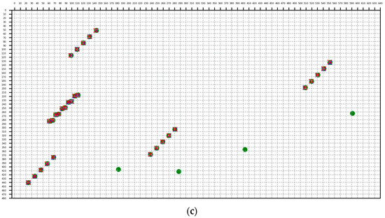 Performance of the proposed multi-frame space object detection method on the test set: (a–c) show the space targets that can be detected correctly in different spatial distribution within one sequence. The prediction results of PP-YOLOv2 detector are marked by the green solid circle; the final results after the post-process procedure of CFS are marked by the red cross symbols. Additionally, the blue cross symbols indicate the ground truth.