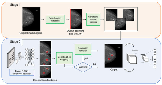 Figure 1. Stage 1 includes breast region extraction and square patches’ generation steps. In stage 2, a trained model locates breast masses and classifies them into BI-RADS categories. Finally, using bounding box mapping and duplication removal algorithms, detected bounding boxes from patches are mapped into the original image.