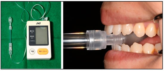 - Utanohara, Y.; Hayashi, R.; Yoshikawa, M.; Yoshida, M.; Tsuga, K.; Akagawa, Y. Standard Values of Maximum Tongue Pressure Taken Using Newly Developed Disposable Tongue Pressure Measurement Device. Dysphagia 2008, 23, 286–290. [Google Scholar] [CrossRef] [PubMed]