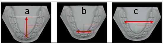 Measurement of maxilla and mandibular arch sizes. (a) arch length, (b) intercanine width, and (c) intermolar widths.