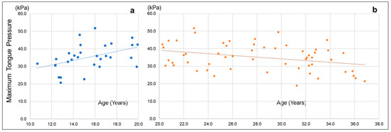 It has been shown that the population’s MTP starts to decrease after the age of 60 [15,16,17]. In this study, we focused on pediatric and adult populations with malocclusion who were seeking orthodontic treatment. There was a positive correlation between MTP and age from age 10 to 20 (Figure 3a. R = 0.47, p < 0.05 (0.00948)). There was a negative correlation with MTP and ages 20–40 (Figure 3b. R = −0.30, p < 0.05 (0.02428)). Furthermore, MTP in the 31–40 age group was significantly lower than that of the 21–30 age group. This nonlinear biphasic result revealed that the MTP of patients with Angle classification I, II, and III malocclusions started to decrease at an earlier age (31–40) than that of the normal population (61–70) [1,15,24]. This early loss of MTP is significant, since previous research shows that a decrease in MTP is correlated with dysarthria [5], dysphagia [6], malnutrition [9], and sarcopenia [10]. Thus, early treatment of all malocclusions may benefit by preserving MTP or preventing the early decline in MTP.