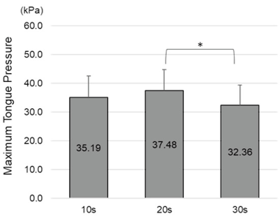 Previous research has focused on maximum tongue pressure (MTP) in the vulnerable population such as children and older adults. Children with skeletal Class II malocclusion were shown to have a lower MTP [11]. In older adults, there has been a correlation shown between tongue pressure and malnutrition [9], sarcopenia, sarcopenic dysphasia [10,12], and general frailty [13]. It was observed that MTP decreased with age in the older population [14]. It has also been shown that tongue pressure is stable from age 20 to 50; then, it becomes significantly lower by age 70 [15,16,17].