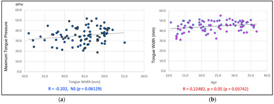 (a). Correlation between MTP and tongue width. (b). Correlation between tongue width and age.