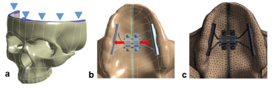 Figure 4, blue triangles were only used to indicate where the boundary region of the FEA model was applied; hence, the boundary condition was applied at the cutting plane of the FEA model. The loading in the FEA model was applied in 20 steps of expansion displacement to reflect the expansion treatment protocol. The segmental load steps could provide slight changes of the suture expansion on the maxillopalatal bone by the use of rapid maxillary expansion.