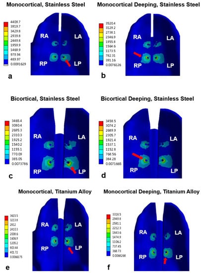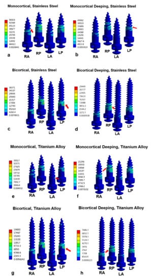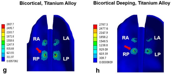 Table 2). The difference between the bicortical model (2213.15 MPa) and the monocortical model (2787.58 MPa) was 22.97%, the difference between the bicortical deepening model (2105.60 MPa) and the monocortical model (2787.58 MPa) was 27.87%, the difference between the bicortical model (2213.15 MPa) and the monocortical deepening model (2646.48 MPa) was 17.83%, and that between the bicortical deepening model (2105.60 MPa) and the monocortical deepening model (2646.48 MPa) was 22.76%. The difference between the monocortical deepening model (2646.48 MPa) and the monocortical model (2787.58 MPa) was 5.19%, and that between the bicortical deepening model (2105.60 MPa) and the bicortical model (2213.15 MPa) was 4.98%.