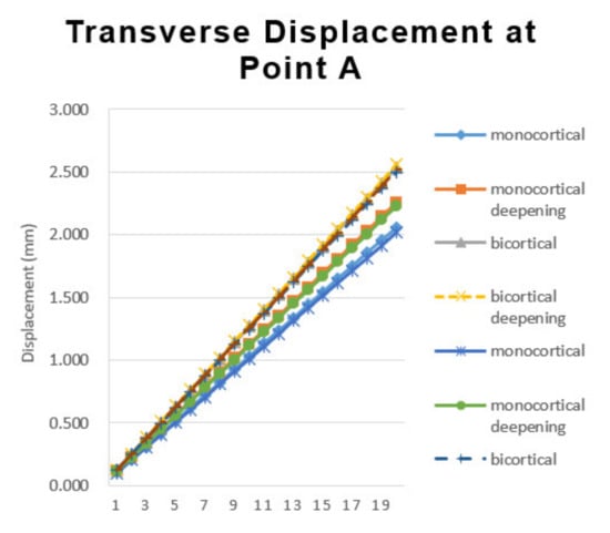 The difference at point A for the total transverse displacement caused by expansion screws with stainless steel mini-implants between the bicortical model (2.534 mm) and the monocortical model (2.056 mm) was 20.83%, the difference between the bicortical deepening model (2.556 mm) and the monocortical model (2.056 mm) was 21.68%, the difference between the bicortical model (2.534 mm) and the monocortical deepening model (2.257 mm) was 11.56%, and that between the bicortical deepening model (2.556 mm) and the monocortical deepening model (2.257 mm) was 12.42%. At point A, the difference in the total transverse displacement between the monocortical deepening model (2.257 mm) and the monocortical model (2.056 mm) was 9.32%, and that between the bicortical deepening model (2.556 mm) and the bicortical model (2.534 mm) was 0.86%.