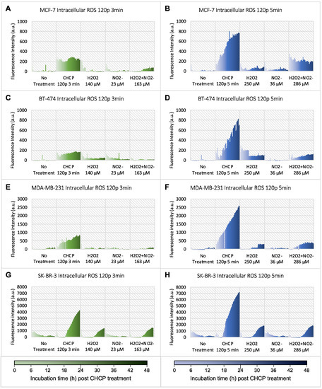 Intracellular ROS measurements of breast cancer cell lines at 0–48 h post CHCP treatment. H2O2 and/or NO2− were used as positive controls. All cells were treated by CHCP at 120 p for 3 and 5 min. (A,B) Treated MCF-7 cells. (C,D) Treated BT-474 cells. (E,F) Treated MDA-MB-231 cells. (G,H) Treated SK-BR-3 cells.