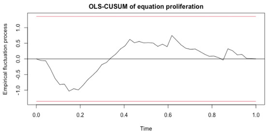 Plot of the Stability Test Output. Example plot showing the stability test outcome for the 3 min MDA-MB-231 Ki-67 model. CUSUM processes were calculated to detect structural changes in the inputted data.
