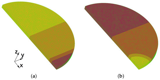 The calculation of the resonance frequency of resonators with a wrap-around electrode will be based on the assumptions made in Section 2.2. In particular, identical finite element meshes will be used for the calculation so that the same discretization error can be achieved and the results from Section 3.1 can be compared with the results obtained for resonators with wrap-around electrodes. The meshes used will be the finite element meshes shown in Figure 3, according to the electrode structure (a) or (b) as shown in Figure 2.