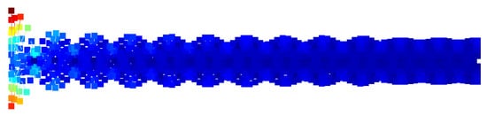 Let us first pay attention to the calculated shape of the oscillation. In the case of a fully electroded resonator, the thickness oscillation is rotationally symmetric along the axis of symmetry of the resonator. For resonators with wrap-around electrodes, the thickness oscillation is symmetric only along the plane of symmetry of the electrodes. The damping of the oscillation can be seen in the area under the wrap-around electrode; see Figure 5, where the oscillation for wrapping-around according to variant (a) is shown. The damping of the oscillation for variant (b) is similar.