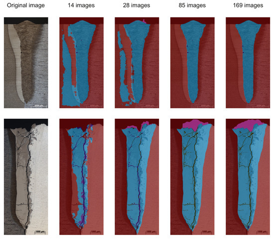 Because the amount of 5% is very small, choosing this sample set randomly may lead to different results. To investigate this, the training was conducted with 10 runs in which the sample set was randomly selected from the total data. In this regard, a standard deviation of mIoU of 0.36% has been obtained. Figure 5 shows two original images and the prediction results with different training sets. The larger the training set, the better the prediction results. An increase in the amount of training data improved the overall results. In this case, due to using a pre-trained network and because the change in performance is small in the range from 85 to 169 images, an amount of about 85 images already led to a good compromise between performance and calculation time. Whether a neural network can learn better in a particular detail cannot be answered by the amount of training data, but the more training data that are available, the more statistically significant and stable the training results are.