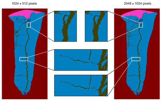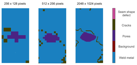 The image resolution used for neural network training is an important indicator that affects the performance. The micrographs used were high resolution images, and almost every image had a pixel count of 3000 × 2000. If the image is compressed, it is helpful to improve the training speed, but a too low resolution weakens or even destroys some features; see Figure 6. A crack is a thin and long weld defect. If the resolution of the image is decreased to 512 × 256, most of the crack disappears. If the resolution is further changed to 256 × 128, almost all of the cracks are not learned. The target is to achieve a good balance of training speed and performance. According to the relationship between the side length of an image and the refinement quality investigated in [19], images with a large resolution are important for the segmentation accuracy. For this reason, the resolution of 2048 × 1024 in this case comes along with a sufficient training speed while ensuring that all features are learned as well as possible.