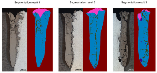 With the trained neural network a segmentation result of any micrograph can be parsed as shown in Figure 8. Using the segmentation results, a determination of the pixel counts for each class is possible. The determined pixel counts reflect the severity of the weld defects and according to the IoU algorithm, the reliability of the segmentation results can be seen. The parsed results of Figure 8 are shown in Table 10.