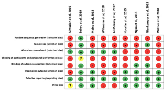 The evaluation of the risk of bias for the selected studies was carried out independently by B.M.S. and L.N., using the Cochrane Collaboration tool (Figure 1). In case of disagreement, the third author (V.G.) was consulted. A consensus was reached through discussion. Risk of bias rated as “low,” “high” or “unclear” included the following: random sequence generation, sample size, allocation concealment, blinding of participants and personnel, blinding of outcome assessment, incomplete outcome data, selective reporting and other biases.