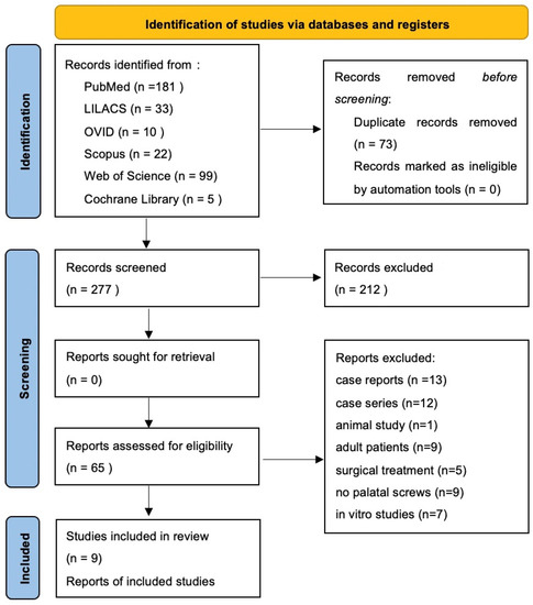 The initial search identified a total of 350 articles. After removing 73 duplicates, 277 articles were screened and 226 articles were excluded after reading the title and abstract due to their poor relevance to the research question. The remaining 65 articles were analyzed. Among these, 56 were excluded for these reasons: 13 were case reports, 12 were case series, 1 was an animal study, 9 included adult patients, 5 showed orthognathic surgery, 9 did not use palatal screws and 7 was an in vitro study. At the end, 9 articles were included in the qualitative synthesis (Figure 2).
