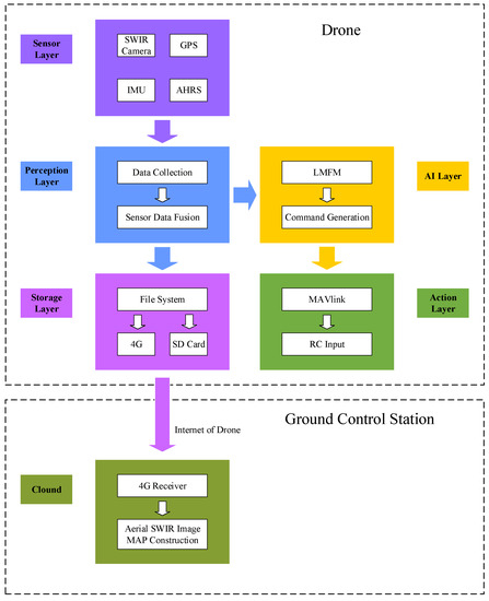 The proposed intelligent aerial remote-sensing system for constructing the aerial SWIR image map is composed of five layers for flying control and data acquisition in an onboard computer, as shown in Figure 2. The sensor layer includes all physical sensors equipped by the drone, such as an SWIR camera (Raptor OWL 640 camera), GPS, inertial measurement unit (IMU), and altitude and heading reference system (AHRS). All sensors are connected to the onboard computer, which is an Nvidia Jetson NANO, and obtain the data to send to the perception layer. The perception layer aims to capture the data from sensors and synchronize all frequencies. Our proposed LMFM was tested in the AI layer and generated a drone control command to send to the action layers. Finally, the storage layer records all data and sends it to the ground control station (GCS). This section describes the flying system settings and data acquisition in the sensor and perception layers.