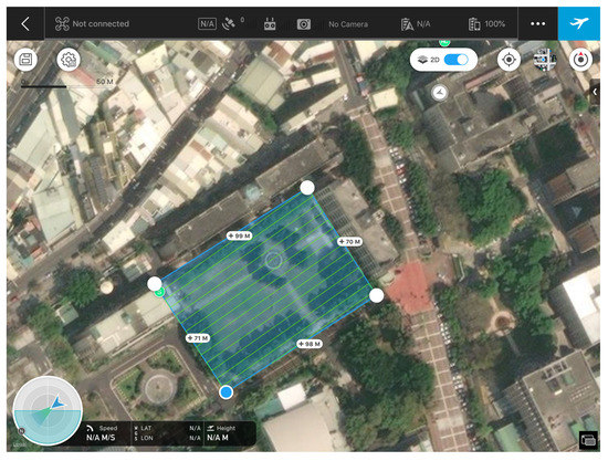 Drones are suitable for performing drone remote sensing, such as air quality and pollution monitoring. Most drone remote-sensing applications need drones to fly around a wide area and sense environmental information. Therefore, drones need a predefined path and must fly along it. Thus, a drone plans a local trajectory using the LMFM to fine-tune its motion. Here, we applied the mission planning software to plan a flying path in the GCS. The drone was powered by one battery, and the standard flight time was 27 min. The onboard computer and all sensors in the sensor layer were powered by another 4S 1000-mAh battery. Both the Zenmuse X4S (RGB camera) and Raptor OWL 640 SWIR cameras were mounted on the drone. The predefined flying path was planned on the GCS, as shown in Figure 3. Then, the drone was deployed to capture only the SWIR images in the predefined flying path.