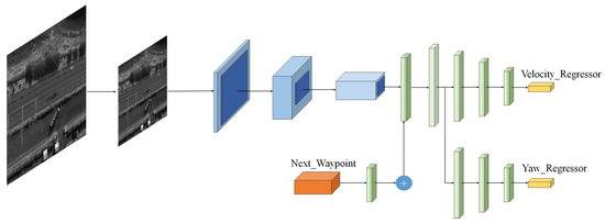 The subnetworks include a dense layer with a depth of 256, whose output is sent to another dense layer with a depth of 32. Finally, the architecture was separated into two branches, which were two linear regressions, including the “Velocity_Regressor” and “Yaw_Regressor” such that v and denote the velocity and steering angle, respectively.