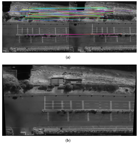 Analyses of the aerial SWIR image map show that it made the drone’s remote-sensing application faster and more comprehensive with a good perception of the environment. Its processed information was useful. The aerial remote-sensing map is the seamless joining of overlapping aerial images to generate a large-scale image. When the drone flies along the mission path in the target region, a series of SWIR image sequences is captured. The aerial SWIR image map construction model merges neighboring SWIR images to form a wider view and high-resolution aerial panoramic map with a large coverage area. Figure 5 shows two aerial SWIR images with overlapping regions, and select key features in these images are shown in Figure 5a, resulting in a stitched image, as shown in Figure 5b.