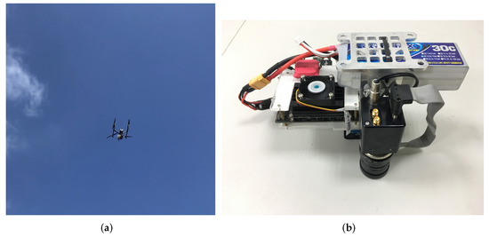 Prototype of the intelligent aerial remote-sensing system. (a) Drone flying using the proposed system. (b) The whole payload of the proposed system.