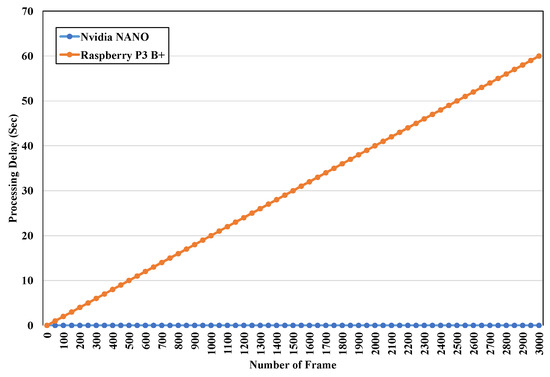 Processing delay of Raspberry Pi 3B+ and Nvidia NANO.
