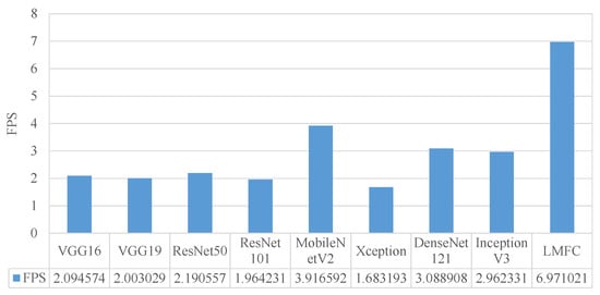 where is the predicted value and is the original value. From Figure 8, it can be seen that our proposed LMFC model had the highest FPS compared with the other models. This was attributed to the LMFC model being a lightweight model. Furthermore, it predicted the two regression values—velocity and yaw—for multitasking effectively. Consequently, the deep learning-based methods, by using our proposed LMFC model, controlled the drone as well as obtaining clear SWIR images for remote-sensing tasks. The model’s performance analysis is shown in Table 2. Our proposed LMFM had similar low and values to the other models. However, our proposed LMFM had better values and a lower computational time. Thus, it was the most suitable one to be mounted on the onboard computer.