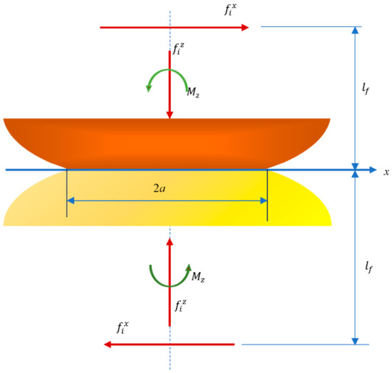 Thus far, the analysis is just for a slipping sphere. Considering the oscillating force theory of Johnson [2], this area is ring-shaped in geometry, with a radius range of . What is more, when analyzing the un-slipping sphere for the symmetrical characteristic, the loaded force component could be assumed as: