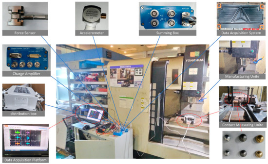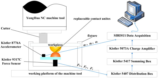 According to Equations (52) and (53), to get the tangential stiffness, the displacement of the contact area and and the contact force differences and of x and y-directions is necessary. and could be measured by the double integral acceleration signal of its relative direction, which could be collected by a Kistler 8776A triaxial IEPE accelerometer. The contact forces and could be gathered by a Kistler 9317C 3-component force link. Meanwhile, the frictional coefficient could be measured through the constant speed slide experiment with a spring dynamometer. The eventual goal is to calculate the relative error between the measured tangential contact stiffness and the predicted ones.