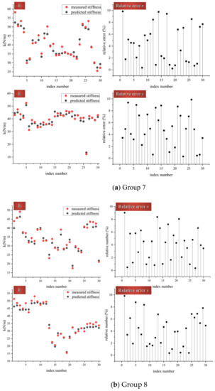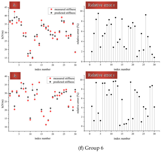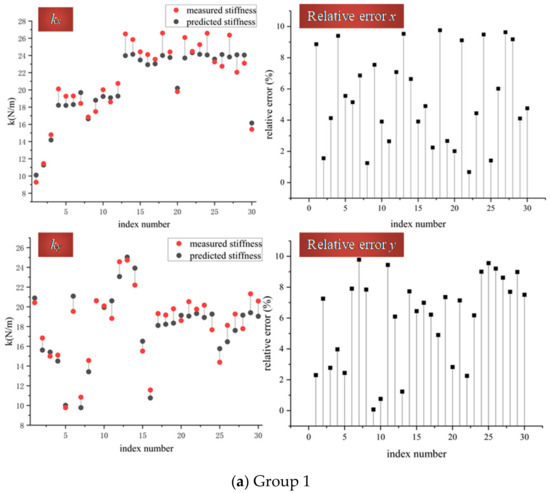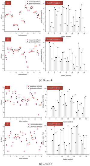 Each group has been taken 30 sets of data randomly. As shown in Figure 7, the similar phenomenon from the x-direction could be carried out so that the relative error of the modified model is much smaller than the original one. Specifically, in the original model, a relative error above 50% occupies more than 3/4 of the 30 data sets in each of these 8 groups, and only 1/4 of these groups’ relative error is below 30% in half of the data sets, such as Groups 4 and 7. While comparing with the relative errors of the modified model in these 8 groups, they are all less than 10%, which is similar to the relative error of the tangential stiffness model along the x-axis. What is more, in Groups 5, 6 and 8, the relative error of the modified model is much smaller than the original one for most of the data sets of each group.