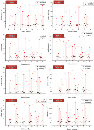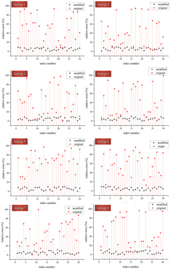 To make the comparison result visible for analysis, it is necessary to narrow the data scale presented in one picture. Picking out 30 sets of data from each group randomly seems to be an excellent choice for this data visualization process. As is depicted in Figure 6, the relative error of the original model is apparently bigger than the modified one, which is the key point to present the improvement to the research from this paper. Specifically, in the original model, the relative error above 50% occupies more than half of the 30 data sets in each of these 8 groups, and only one-quarter of these groups’ relative errors are below 30% in half of the data sets. Compared with the modified model, the difference is too overt to see. The relative errors of the modified model in these eight groups are all below 10%, and that means the variance of the modified model’s relative error is much smaller than the original one. What is more, in Groups 1, 2 and 4, the relative error of the modified model is much smaller than the original one for most of the data sets of each group.