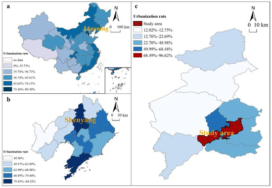 Schematic diagram of the study area: (a) the urbanization rate of China’s provinces; (b) the urbanization rate of cities in Liaoning Province; (c) the urbanization rate of districts of Shenyang.