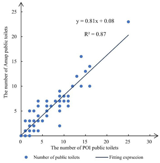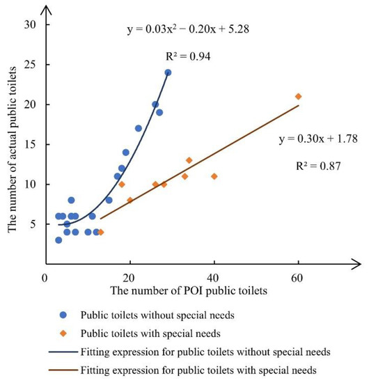 A comprehensive field survey was conducted on thirty data samples to obtain information on the number of public toilets, the availability of public toilets for special needs, sanitation and cleaning facilities, and the number of people accommodated. The number of POI data in the thirty samples was used as the independent variable. The number of public toilets from the field survey data was used as the dependent variable for data fitting. The actual number of public toilets for the nine samples of special needs public toilets was slightly larger than one-third of the number of POI public toilets. After the constructed exponential, logarithmic, linear, and polynomial fits, the linear fit gave the best results with a goodness of fit R2 of 0.87 and a range of residuals of [−2.79, 2.83]. The actual number of public toilets in the twenty-one samples without special needs is much larger than one-half of the number of POI public toilets. The constructed fitting expression obtained the best polynomial fit result with a goodness of fit R² of 0.94 and a range of residuals of [−2.84, 2.75] (Figure 3). The number of POI public toilet data was amended by the fitting results of the dependent public toilets, and finally, five hundred and eighty-nine dependent public toilet data were obtained.