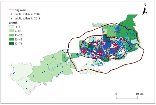 At the population level, from 2008 to 2018, the number of public toilets per 10,000 people (NTP) in the main urban area of Shenyang grew from 0.34 to 3.02. It is higher than the average of 2.77 in China and 1.84 in Liaoning Province. According to the number of public toilets per ten thousand people in 2008, the number of public toilets in the main urban areas of Shenyang was divided into five levels according to the natural break method, including 0 public toilets per ten thousand people in 18 community units, and the maximum number in Ertaizi sub-district of Dadong district, at 1.13. In 2018, the minimum number of public toilets per ten thousand people was 0.46 in Minglian sub-district of Huanggu district, and the maximum was 13.86 in Xinbeizhan sub-district of Shenhe district, with a significant increase in the number of public toilets per capita. Among seventy-four community units, seventy-three showed an increasing trend. The average increase was 2.69, among which Xinbeizhan sub-district in Shenhe district had the largest increase of 13.59, and Tawan sub-district in Huanggu district had the smallest increase of −0.50. In terms of distribution, the areas with a high value of public toilets for ten thousand people in 2008 were all concentrated inside the Second Ring Road, and the number of the lowest grade and lower grade areas was forty, accounting for 54%. The number of public toilets in eighteen community units was zero, causing the value of public toilets for ten thousand people to be zero. The reason is that the POI data acquisition system in 2008 was imperfect, and the POI data were concentrated inside the second ring road, with less data distribution outside the ring road, causing errors in the calculation of the index system. In 2018, higher-grade and higher-grade regions began to expand outside the second ring road, and gradually expanded to the third ring road region. Low-grade regions appear within the first ring line because of the robust and high coverage of POI data in 2008, resulting in less growth of POI data in 2018 and a small rate of population growth than the central area; thus causing some regions to change from high ratings to low ratings. From the overall time series, the number of public toilets owned by ten thousand people has increased greatly. Due to the robust POI data acquisition system, the community units with a small number of public toilets per capita had the most significant increase in the number of public toilets owned by ten thousand people in 2008 (Figure 7). Compared with the spatial level, the level of public toilets in community units outside the Second Ring Road of Dadong district increased in 2018, mainly because of the uneven distribution of population around the Second Ring Road. This led to the difference between the distribution results and the spatial kernel density of public toilets.