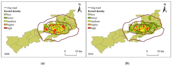 Kernel density of public toilets in Shenyang: (a) distribution of Kernel density in 2008; (b) distribution of Kernel density in 2018.