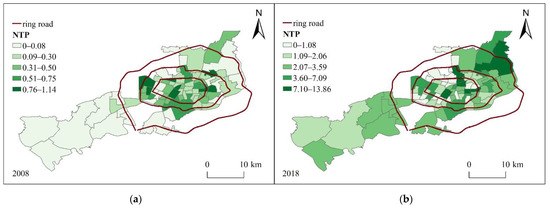 NTP of public toilets in Shenyang: (a) distribution of NTP in 2008; (b) distribution of NTP in 2008.