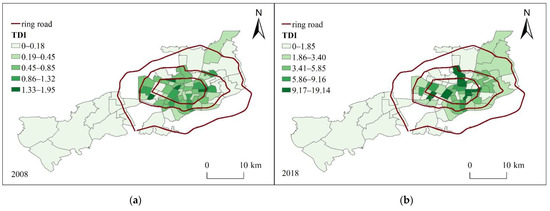 TDI of public toilets in Shenyang: (a) distribution of TDI in 2008; (b) distribution of TDI in 2008.