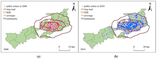 Distribution of standard deviation ellipse and 500 m coverage of public toilets: (a) distribution of SDE and 500 m coverage in 2008; (b) distribution of SDE and 500 m coverage in 2018.