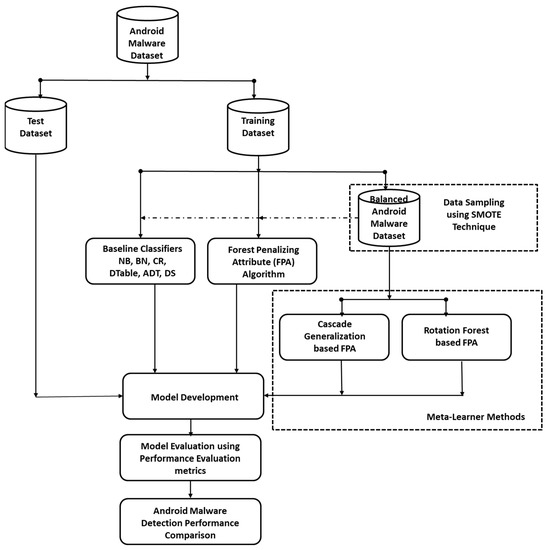In addition, enhanced variants of FPA based on cascade generalization and rotation forest meta-learners are proposed. These meta-learners are proposed to amplify the detection performance of FPA to generate a robust and generalizable Android malware detection model (Cas_FPA and RoF_FPA). In addition, the synthetic minority oversampling technique (SMOTE) is used as a data sampling method to alleviate the class imbalance problem in Android malware datasets.