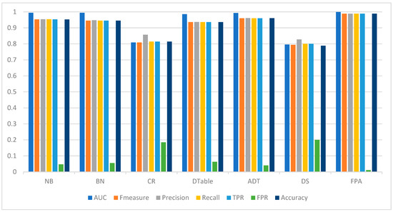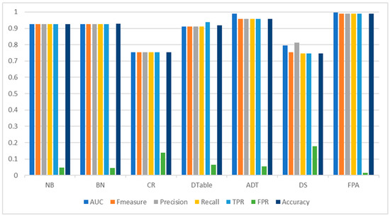 Scenario 1: First, FPA and selected ML algorithms with varying computational characteristics were specifically applied to the original Android malware datasets. The result of this experiment will empirically validate FPA’s performance and efficacy in detecting Android malware. Furthermore, to resolve the inherent class imbalance in the Android malware datasets, a data sampling technique was deployed. In other words, data over-sampling (SMOTE) was employed to resolve the class imbalance in the malware datasets. SMOTE is a notable data sampling approach used to solve the issue of class imbalance [27,28]. The results of these tests will show the influence of the data sampling approach in FPA in Android malware detection.