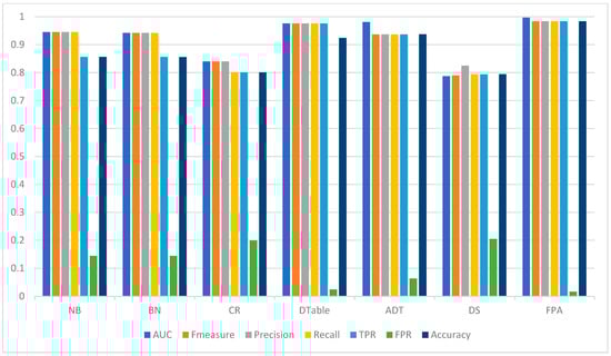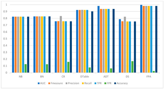 In this section, we present and discuss our results based on the experimental framework as outlined in Section 3.3. Table 6 and Table 7 compare the detection performances of FPA against baseline classifiers (NB, BN, conjunctive rule (CR), decision table (DTable), alternating decision tree (ADT), and decision stump (DS)) on the original Android malware datasets. It should be noted that the selection of the baseline classifiers was based on their diverse computational characteristics and performance as reported in existing studies. Furthermore, Table 8 and Table 9 present the detection performances of FPA against the baseline classifiers on SMOTE-balanced Android malware datasets. The purpose of this is to showcase the effect of the data sampling method (SMOTE) on the performance of FPA. Table 10 and Table 11 present analyses of the detection performance of FPA and its enhanced variants (Cas_FPA and RoF_FPA) on the SMOTE-balanced Android malware datasets. Lastly, the detection performance of FPA, Cas_FPA, RoF_FPA, Cas_FPA+SMOTE, and RoF_FPA+SMOTE was compared with existing state-of-the-art Android malware models. This section also includes some figures to illustrate the significance of the research findings. The top results are highlighted in bold, whereas the suggested methods are denoted by an asterisk.