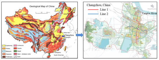 Practical tunnel engineering in Changzhou, China, was considered to investigate the ground surface settlements induced by EPB shield tunneling. Changzhou city lies northwest of Shanghai and has a total area of 4373 km2. Figure 1 describes the location and distribution of the rail track system in Changzhou. Nowadays, Changzhou Metro Lines No. 1 and No. 2 have opened with a total mileage of about 54 km in operation. EPB shield machines were employed to construct the tunnel section of the two opened metro lines. The shield tunnel length of Changzhou Metro is about 26 km in Line No. 1 and about 15 km in Line No. 2. Most shield tunnels were built with a buried depth in the range of 10 to 20 m, and the maximum depth reached was 27.5 m. Shield driving has an inevitable influence on the soft soils in Changzhou, resulting in ground loss and movement. A reliable prediction of tunneling-induced ground movements is of great importance for construction safety management.